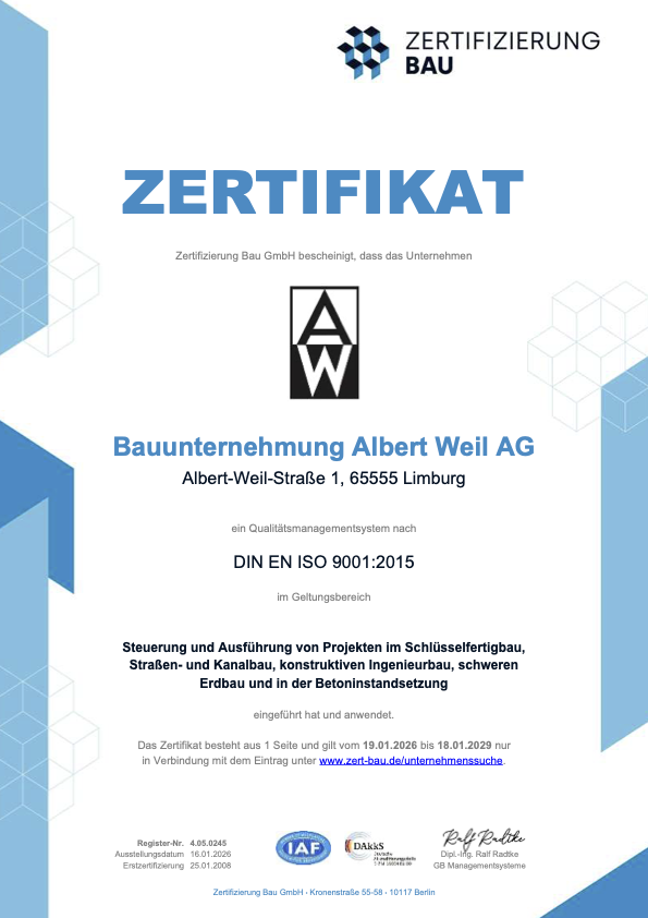 Seit 2019 ist die Bauunternehmung Albert Weil AG ausführendes Mitglied in der Landesgütegemeinschaft Betoninstandsetzung und Bauwerkserhaltung Hessen-Thüringen e.V. (LGGHuT). Weiterhin wurde der Bauunternehmung der Eignungsnachweis entsprechend der Bauprodukte- und Bauarten-Verordnung (BauPAVO) bzw. der Hersteller- und Anwenderverordnung (HAVO) durch die Bundesgütegemeinschaft Instandsetzung von Betonbauwerken e.V. erteilt.